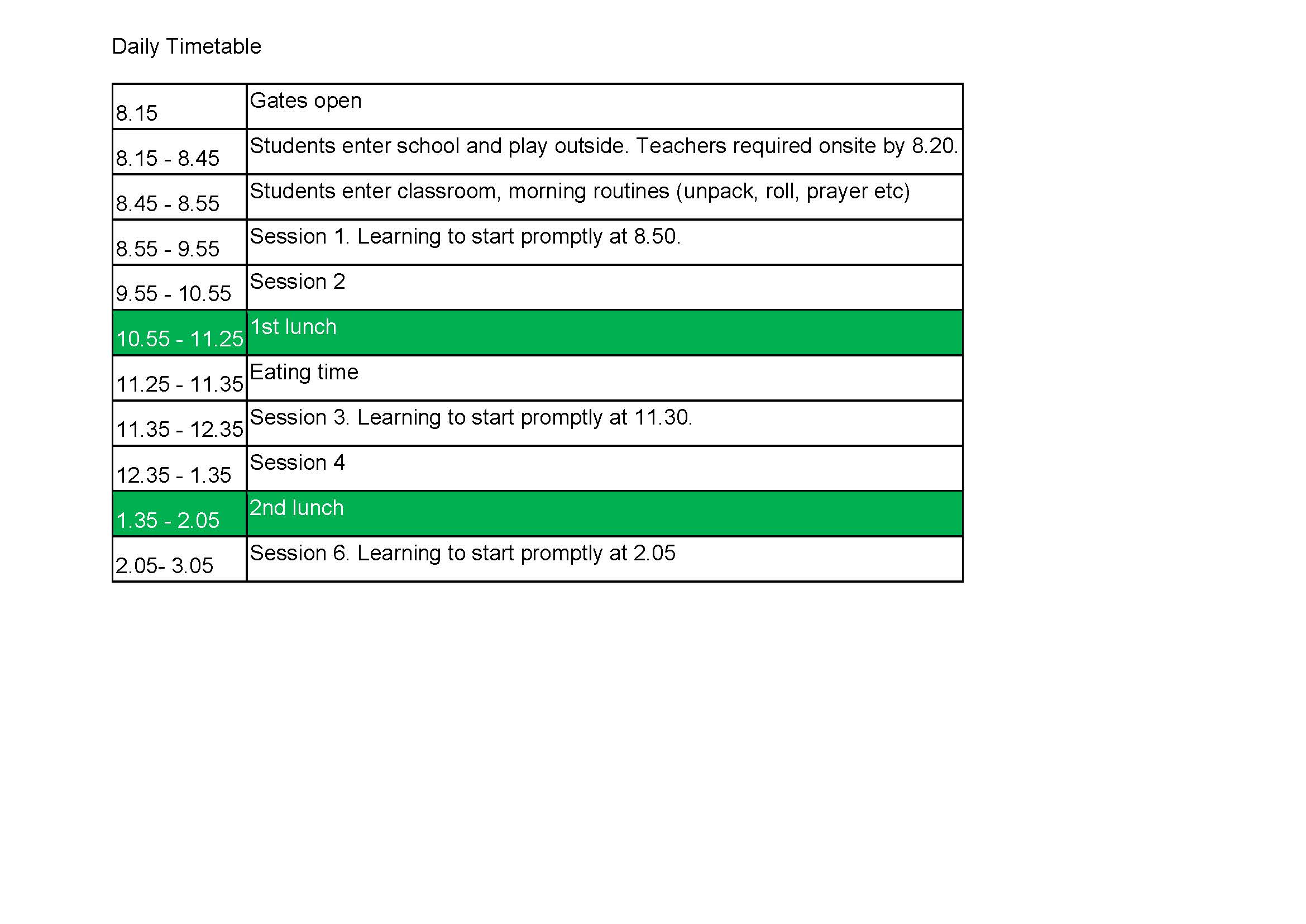 | 11:25am | Bell | Children come into the classroom and eat their Lunch supervised by a teacher |