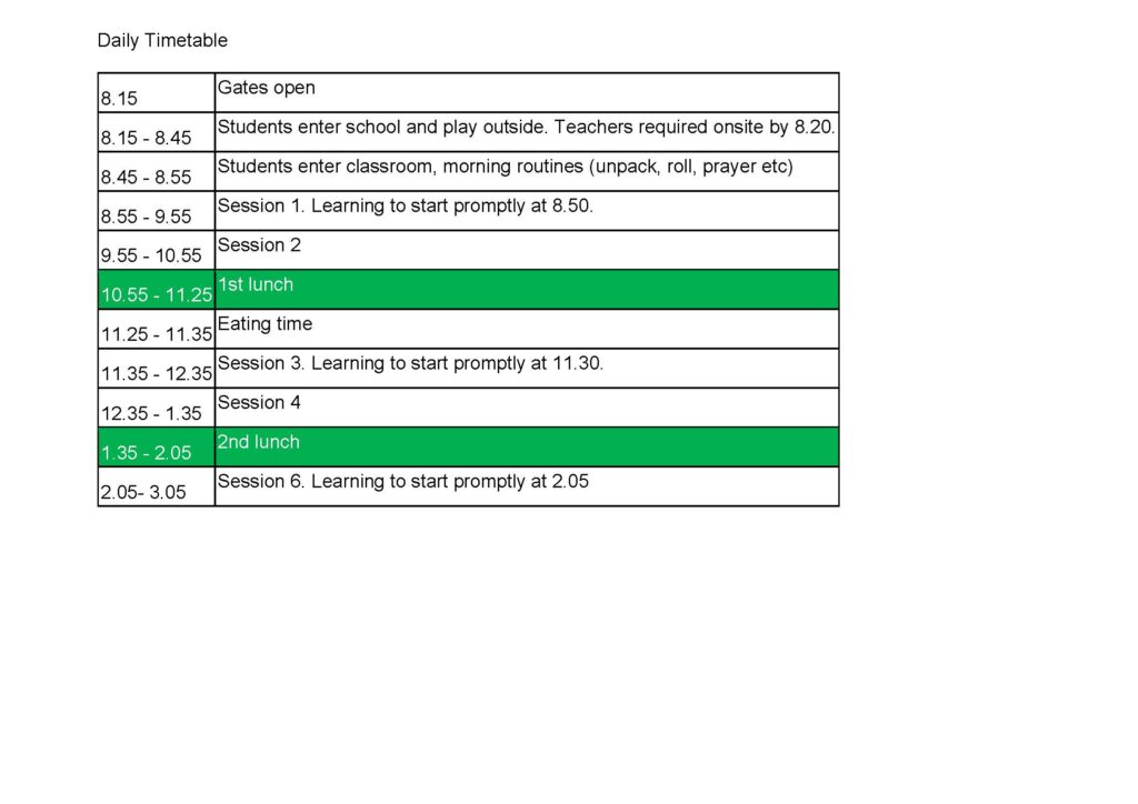 | 11:35am | Bell | Children move to their learning space with their teacher |